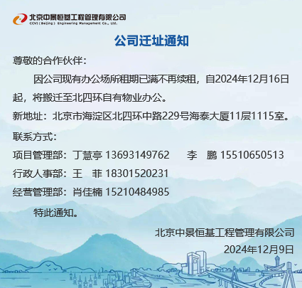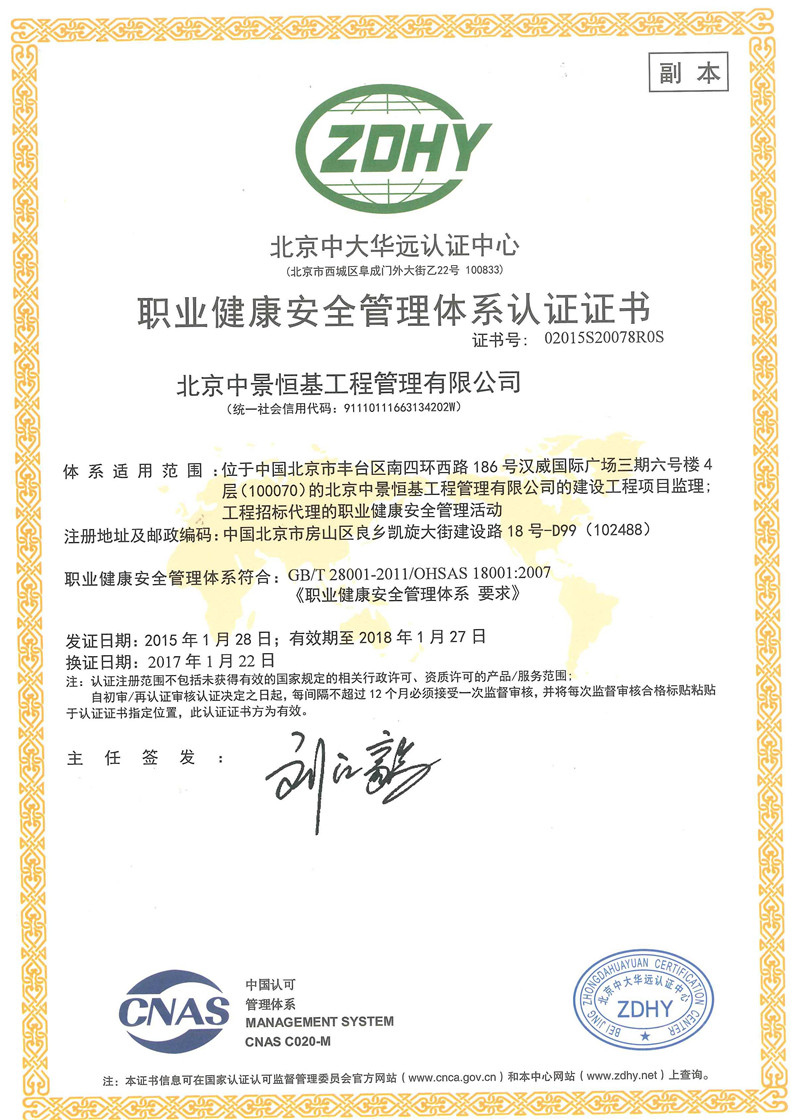 北京中景恒基工程管理有限公司(以下簡稱“公司”) 具有工程監理綜合資質、造價咨詢甲級資質、水利工程、人防工程監理資質和工程招標代理資質,是全國百強監理企業之一。主要從事工程監理、造價咨詢、項目管理、招標代理等咨詢服務 業務。 公司自成立以來,始終注重自身建設,強化內部管理,形成了一套標準化、信息化、科學化的管理模式。率先通過了ISO9001質量管理體系、IS...